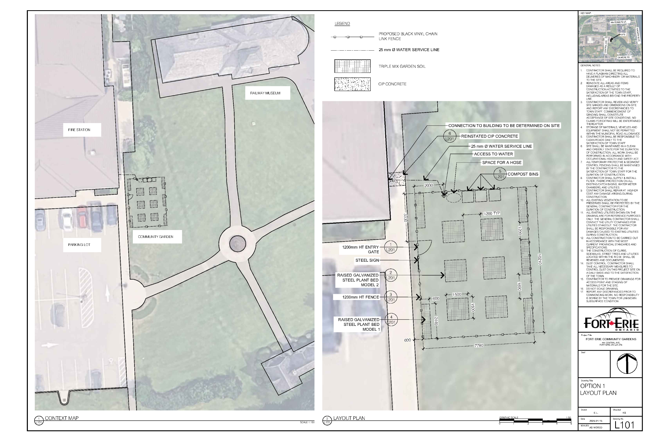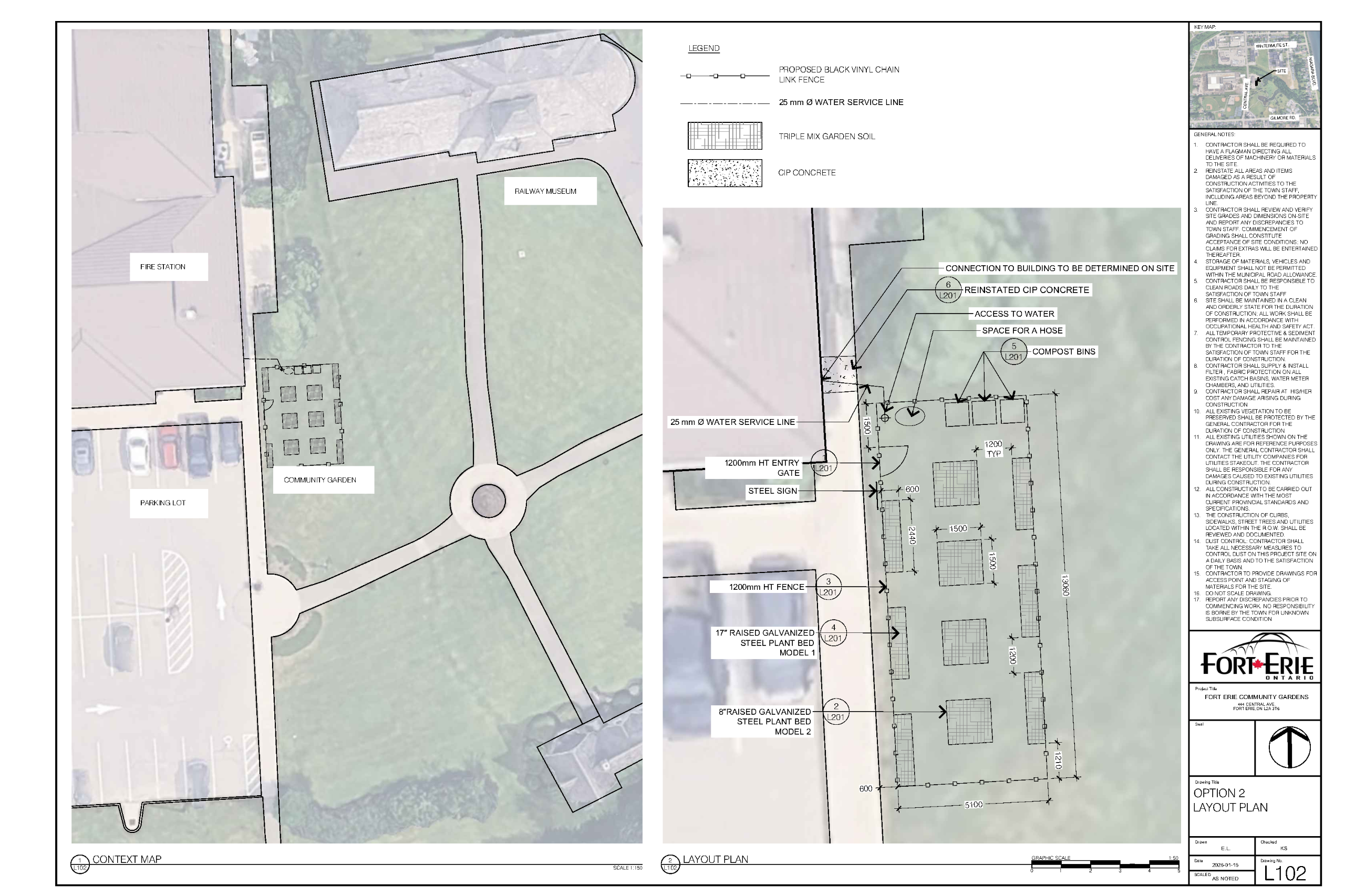 Town staff have a technical design for the garden that will include raised beds and fencing. A water hookup and washroom is close by. The location is on a transit route and has parking.